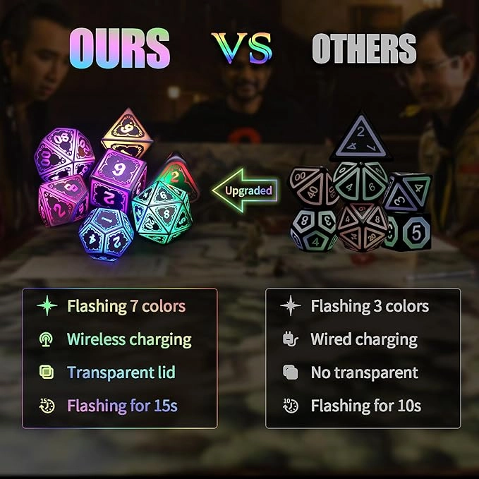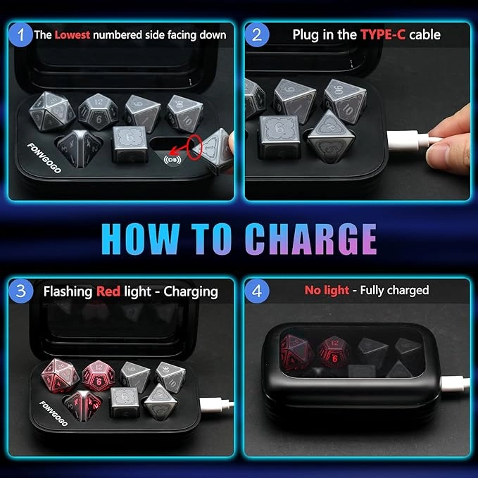 داری شارژر با شارژ کردن جعبه تاس ها بمدت 20 ساعت الی 24 ساعت به حالت روشن و چشمک زن هستند.اما در حالت معمولی و فقط نور داشتن مدت زمان بیشتری نوردهی دارند.